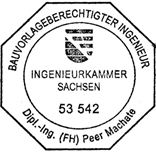 Als Mitglied der Bayerischen Ingenieurekammer-Bau und der Ingenieurkammer Sachsen bin ich sowohl als Bauvorlageberechtigter Ingenieur, als auch als Nachweisberechtigter für Standsicherheit bzw. Qualifizierter Tragwerksplaner eingetragen.
